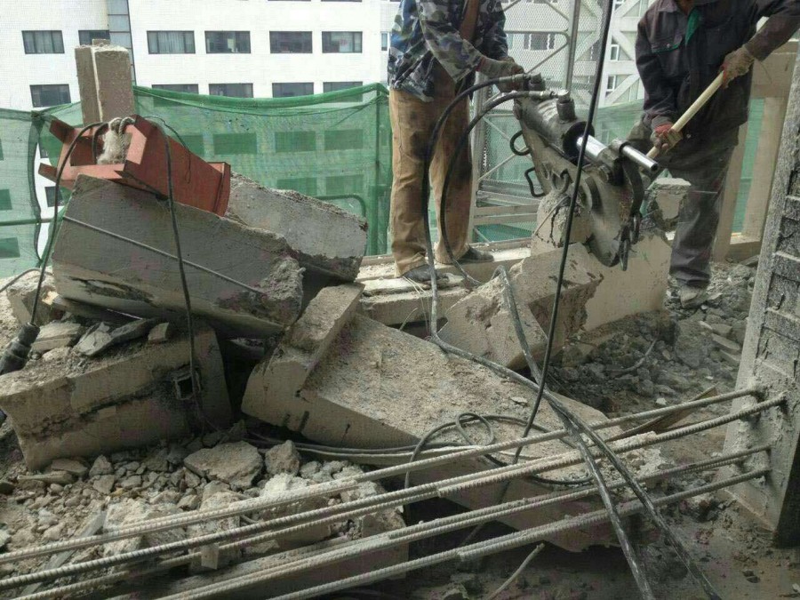 對于原鋼筋混凝土結(jié)構(gòu),采用金剛石圓盤鋸片切割,將原混凝土完全去除,分段、分塊進行作業(yè),切割切割時控制深度,不切割原始結(jié)構(gòu)。對于原有復雜的混凝土結(jié)構(gòu),采用金剛石線鋸切割和金剛石桶鋸鉆孔機鉆孔切割相結(jié)合的方式。