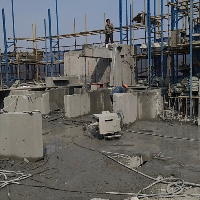 對于原鋼筋混凝土結(jié)構(gòu),采用金剛石圓盤鋸片切割,將原混凝土完全去除,分段、分塊進行作業(yè),切割時控制深度,不切割原始結(jié)構(gòu)。對于原有復(fù)雜的混凝土結(jié)構(gòu),采用金剛石線鋸切割和金剛石桶鋸鉆孔機鉆孔切割相結(jié)合的方式。