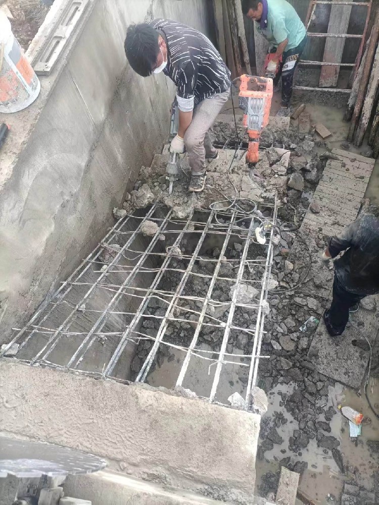 對原鋼筋混凝土結(jié)構(gòu),采用金剛石碟式鋸片切割,將原混凝土全部拆除,采用分段分塊作業(yè),切除時控制切割深度,不切入原結(jié)構(gòu)。對原復(fù)雜混凝土結(jié)構(gòu),采用金剛石繩鋸切割和金剛石筒鋸鉆孔機排孔鉆切組合作業(yè)。