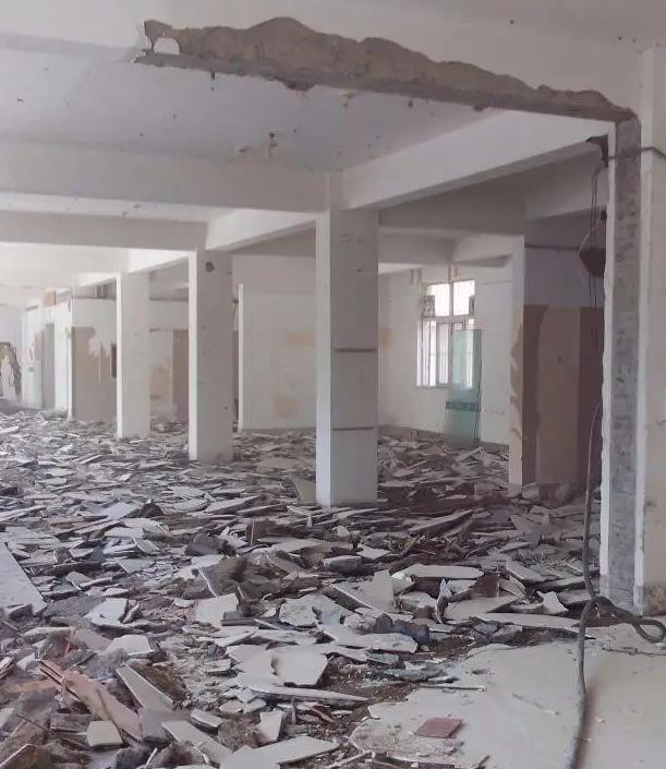 拆除其余樓板:用液壓鉗將剩余需拆除的樓板破碎,將要拆除的樓板清理干凈;檢查所拆除的砼塊是否給其他結(jié)構(gòu)或人體造成危害;當(dāng)距框架柱200mm處不能用液壓鉗,剩下部分用人工剔鑿,切割拆除的混凝土塊,運(yùn)至甲方的外運(yùn)場(chǎng)地。