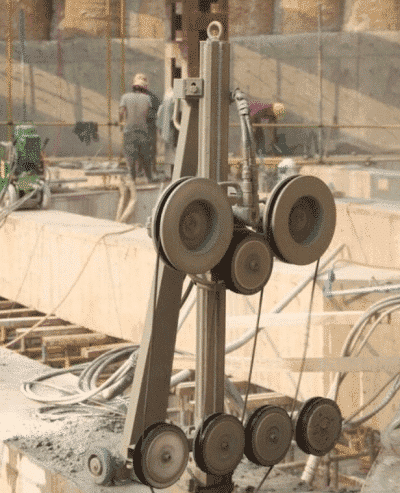 選擇繩鋸切割,繩鋸切割是金剛石繩索在液壓馬達(dá)驅(qū)動(dòng)下,繞被切割物高速行進(jìn)研磨,從而完成切割工作。利用繩鋸設(shè)備進(jìn)行切割可以使鋼筋混凝土的拆除更容易,更安全,更有效。
