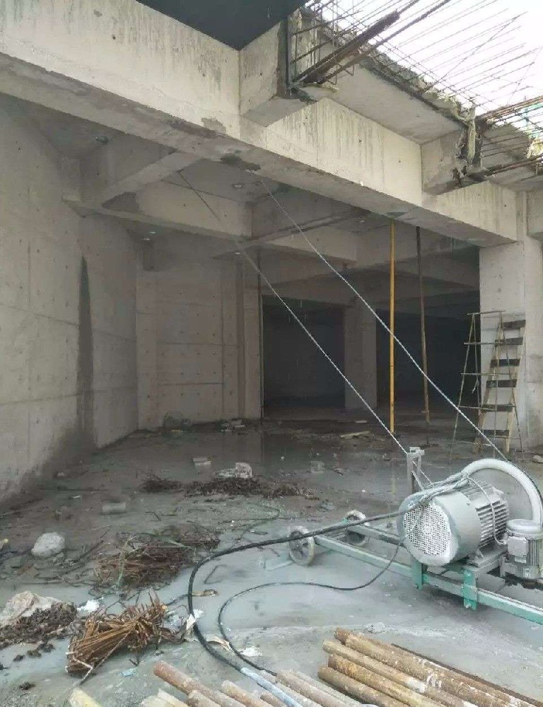 第二步,切割地板:使用專業(yè)拆除切割工具(墻鋸、水鉆切割機等)沿梁邊緣和地板畫紅線方向切割,注意切割地板必須分塊切割,手動移動或使用倒鏈吊裝工具分割地板安全,沿紅線方向切割地板到紅線左側(cè),混凝土用電動工具破碎拆除剩余原地板鋼筋,彎曲鋼筋90度;