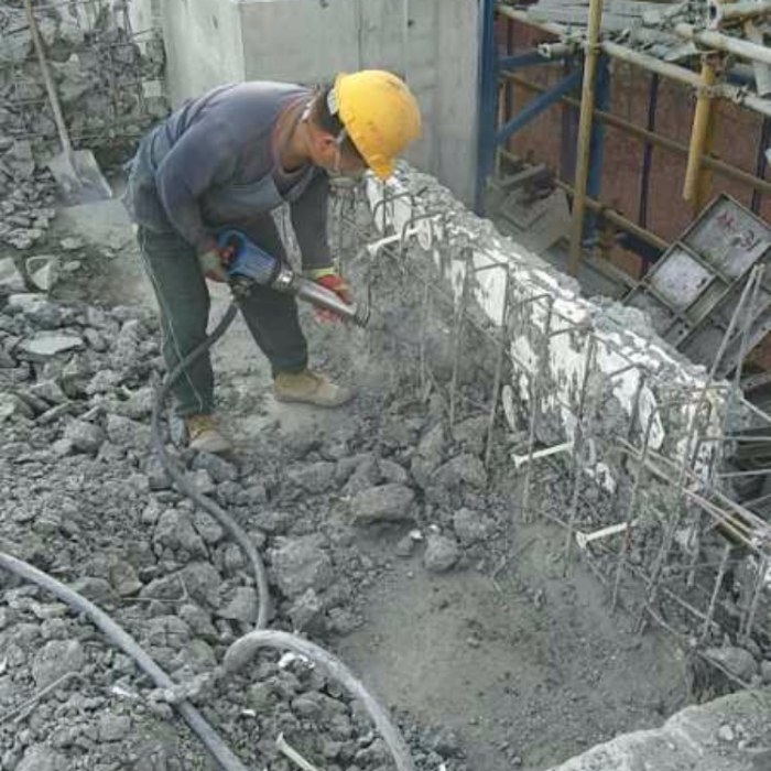 對(duì)于原鋼筋混凝土結(jié)構(gòu),用金剛石圓盤鋸片切割,將原混凝土全部去除,采用分段作業(yè)。切割時(shí)控制切割深度,不要切入原始結(jié)構(gòu)。針對(duì)原有復(fù)雜的混凝土結(jié)構(gòu),采用金剛石繩鋸切割和金剛石筒鋸,鉆床組合進(jìn)行鉆孔和切割。